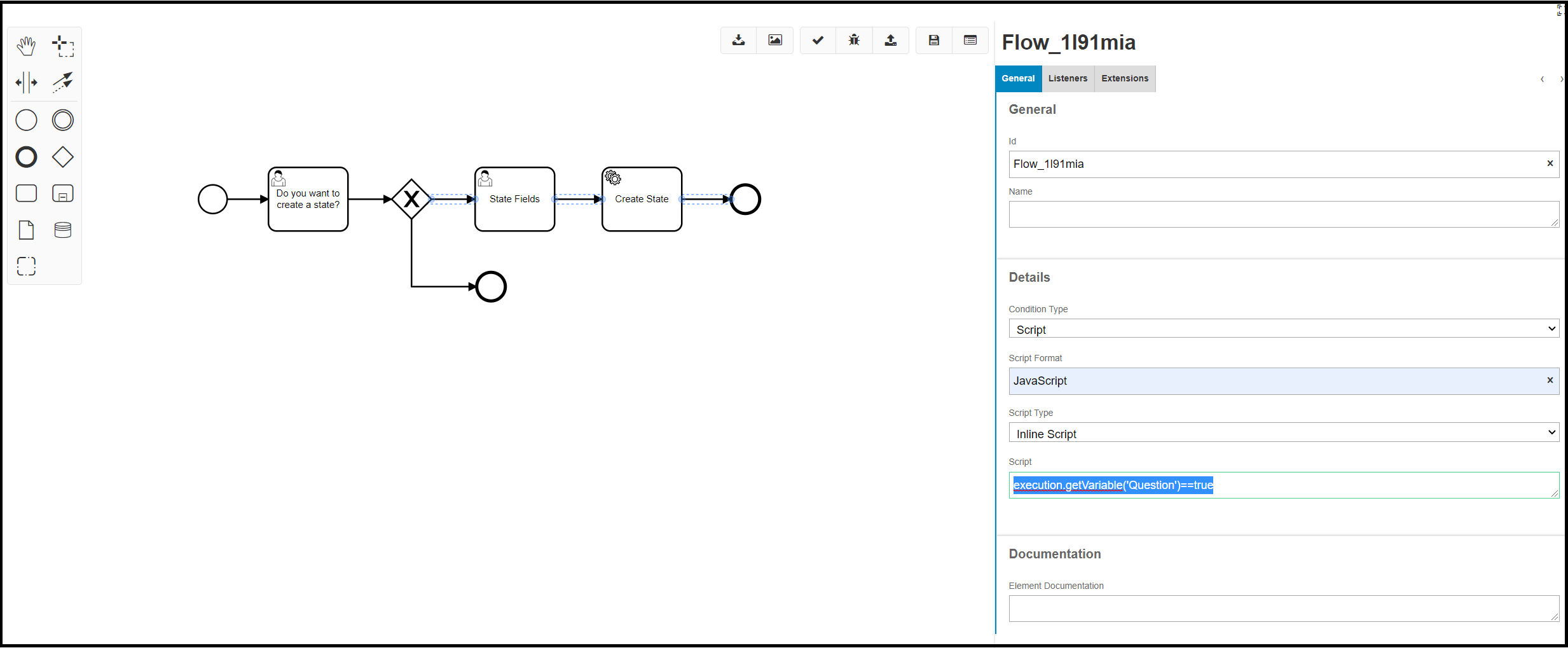 After the tasks have been added to the Workflow, the user will need to add conditions to any Gateways/Decisions that have been added to ensure that the Workflow transaction follows the correct route of the Workflow. The syntax for the conditions is JavaScript or Camunda Expression Language and more information can be found on this in the Condition Syntax section. An example of the JavaScript syntax can be seen below where the decision’s condition is evaluating a field of one of the User Tasks. If the field named “Question” - which is a non-database field/variable in this example - is answered true, then the condition is met. Once the Workflow is configured the relevant End Points need to be added to ensure the transaction completes and finishes accordingly.