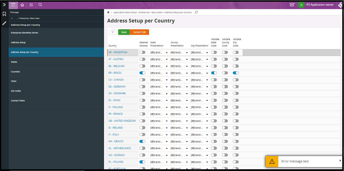 The error message text that has been configured is to show “Error message test”.