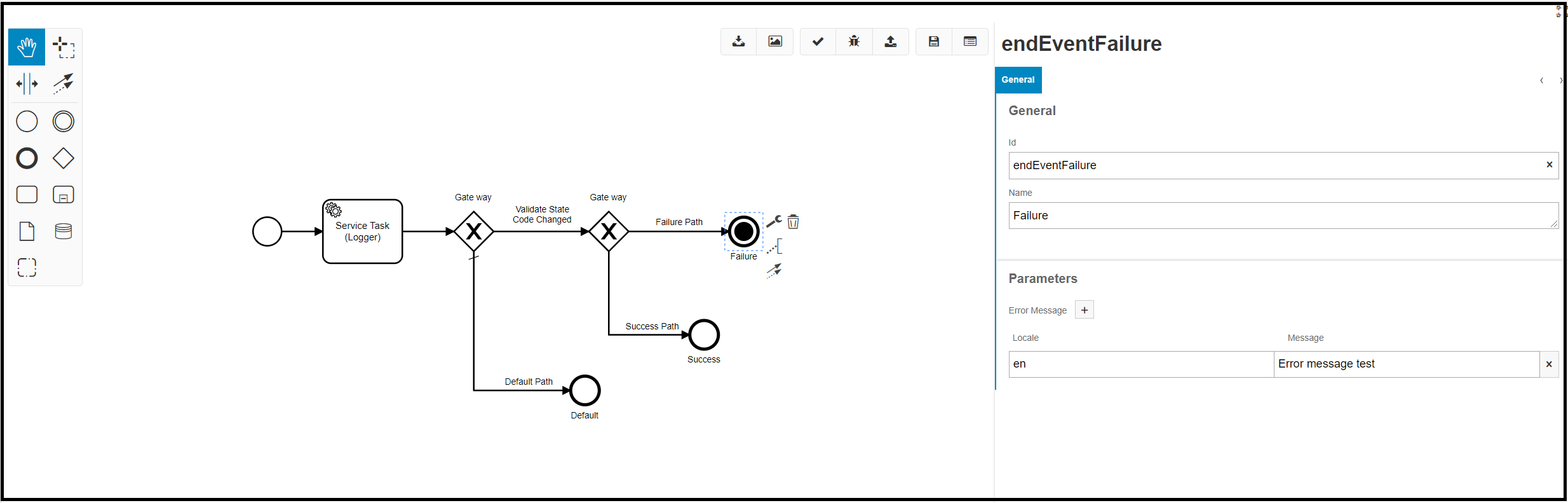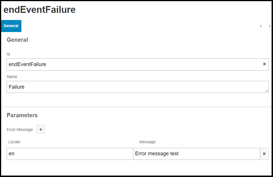 When assigning the failure event and clicking on that event, the properties for the failure event will be displayed within the Properties Panel as depicted above. The user is encouraged to provide multiple locale codes and messages to support all users within the system. The messages provided within the Properties Panel will be displayed to the users when the failure conditions defined within the Workflow are met.