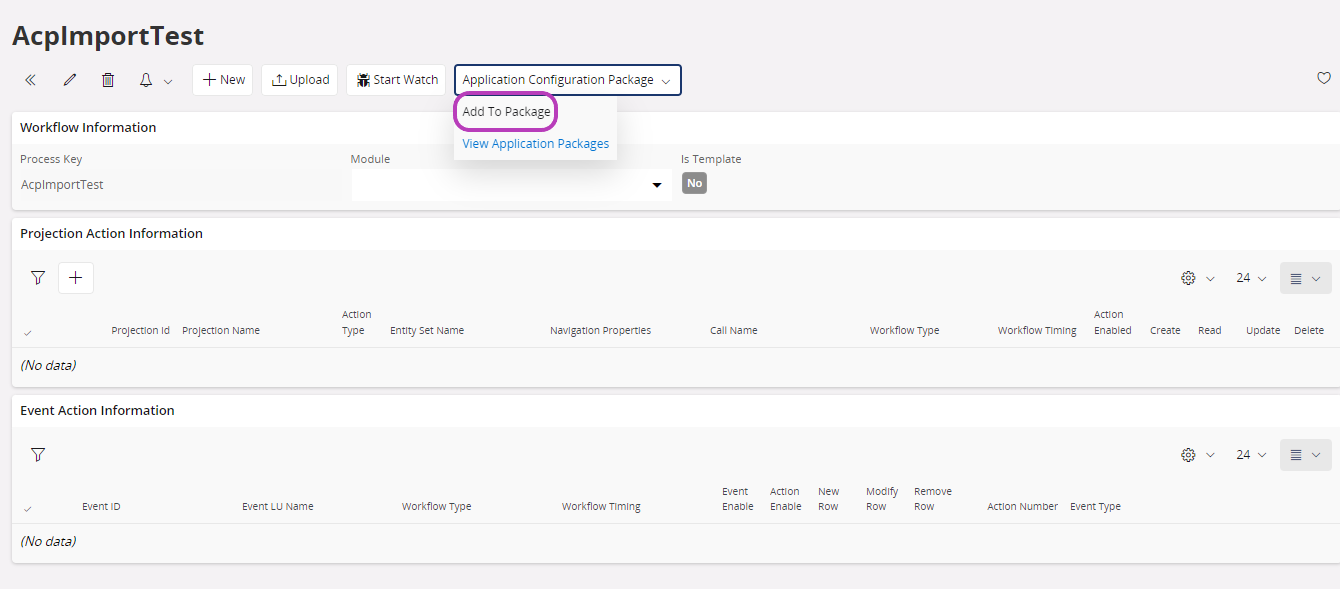 The Workflow, associated projection action(s), and custom event action(s) configurations will be automatically added to the ACP. If any event actions are associated with the workflow, the custom event linked to that event action will also be added to the ACP.