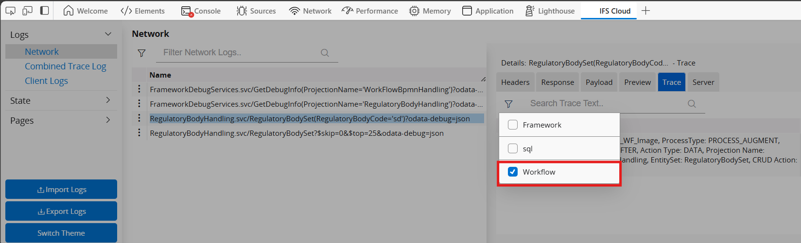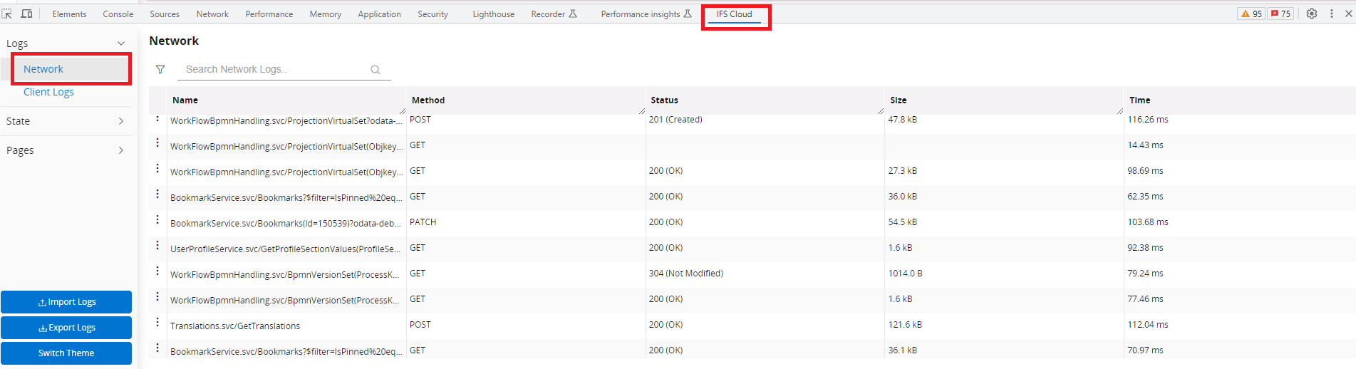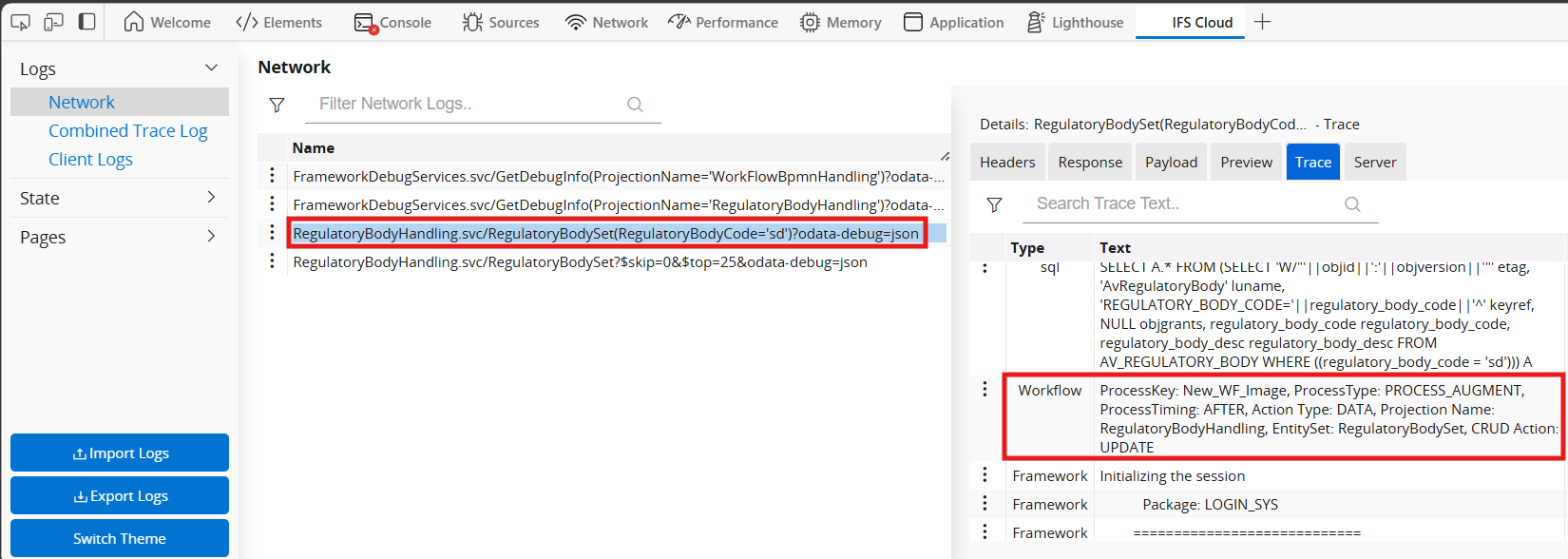 Once these configurations are done, you will see the trace details in the IFS Cloud extension under Logs >> Network