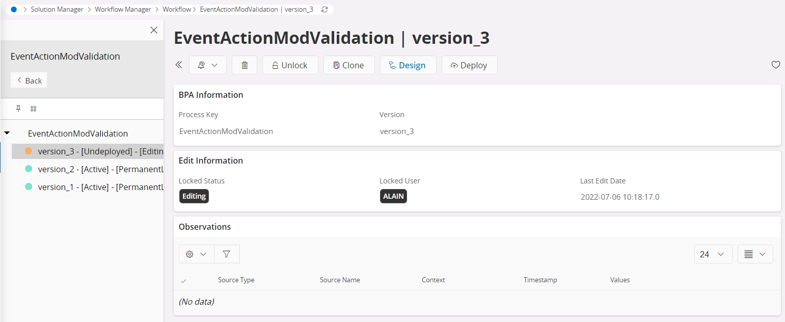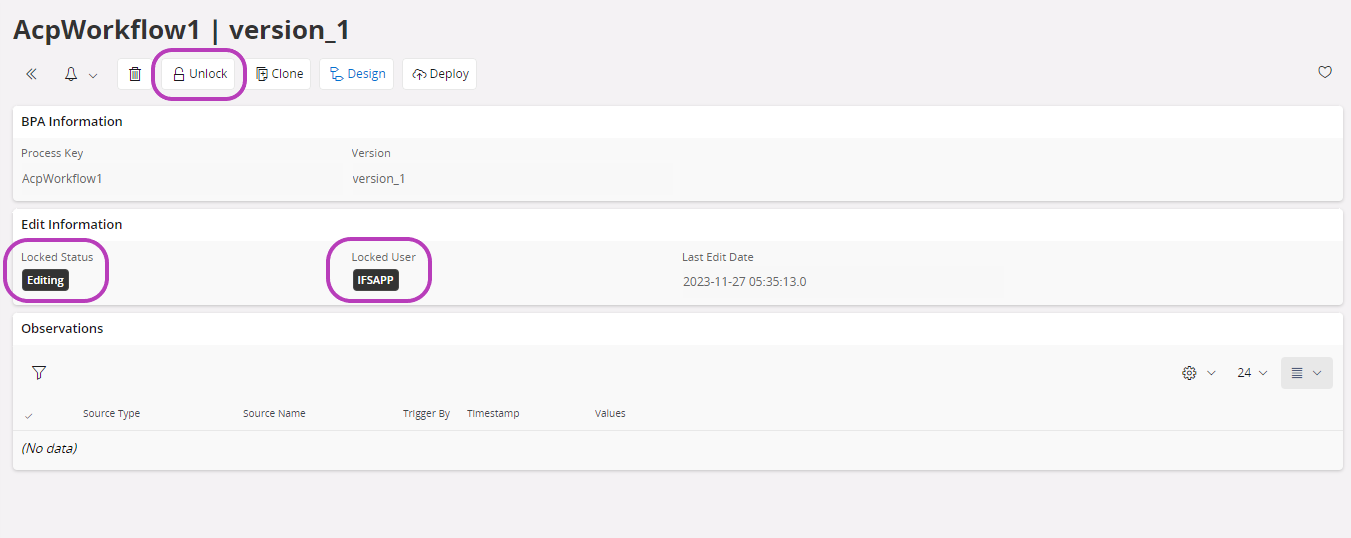In this case, both deployed user and the locked user will be ACP_SYS. To start editing, the Workflow needs to be unlocked by an Admin user first.