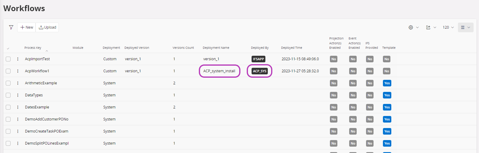 Workflows imported by an ACP and deployed by the installer can be identified in Workflows page as shown in below image. In the image AcpWorkFlow1 (process key) is deployed via the installer.