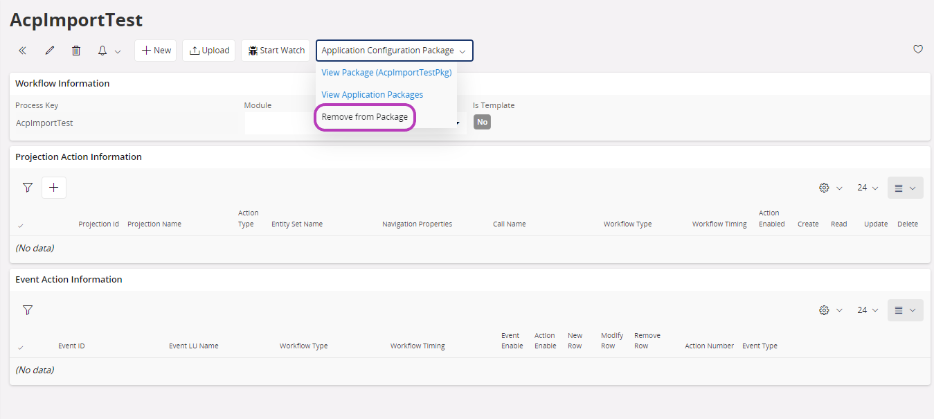 A Workflow can be removed from an ACP Via Workflow page. The Workflow, associated projection action(s), and custom event action(s) configurations will then be removed from the ACP.