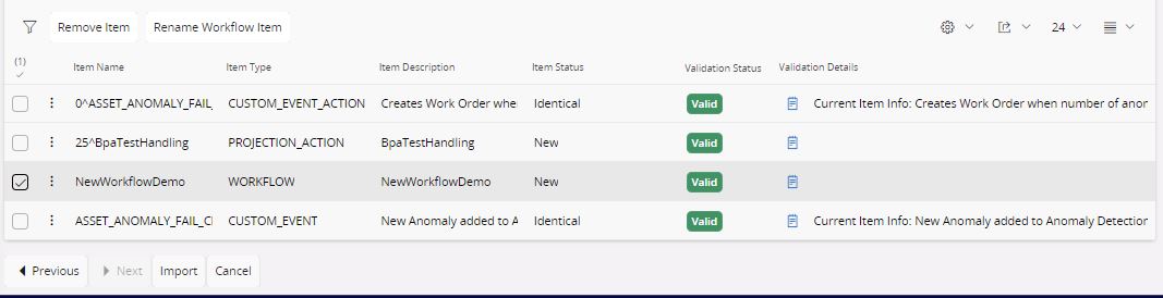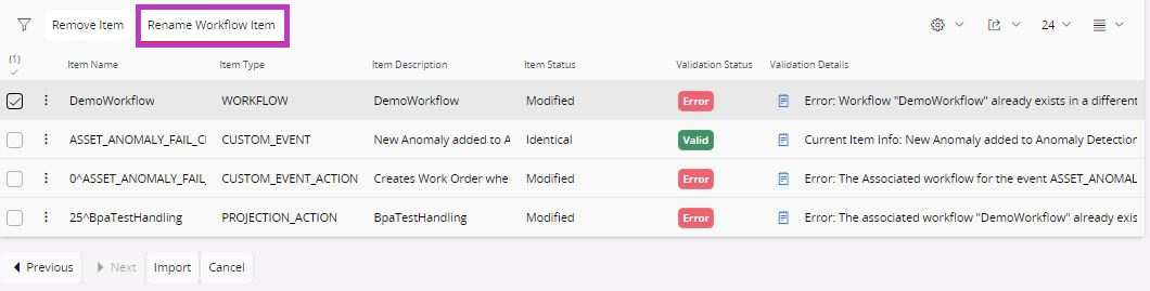 In a situation where a Workflow and associated configurations can't be imported due to validation errors as mentioned in the above scenario, the Workflow can be renamed using the 'Rename Workflow Item' button and it can be imported with a different name. This button is visible only for WORKFLOW type items.