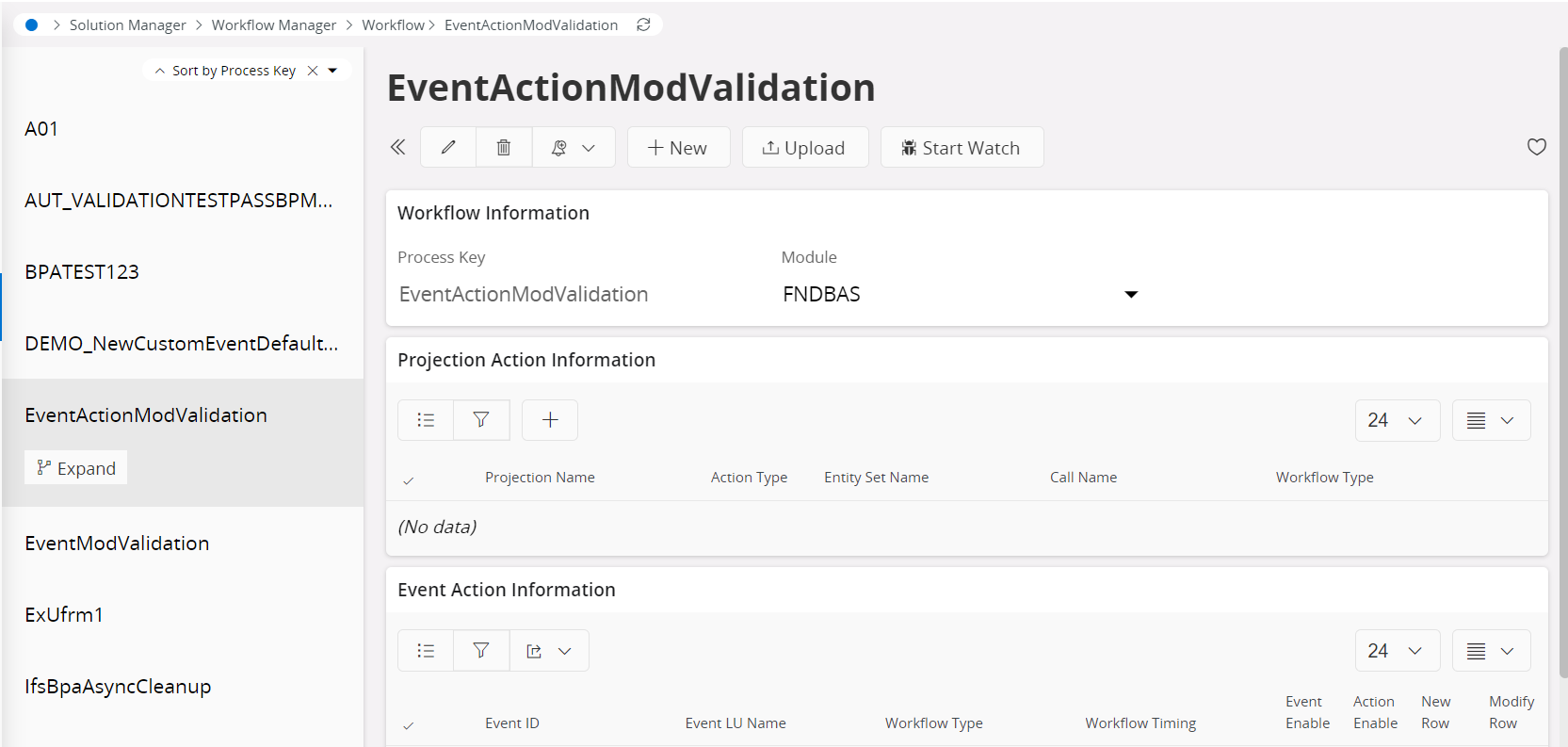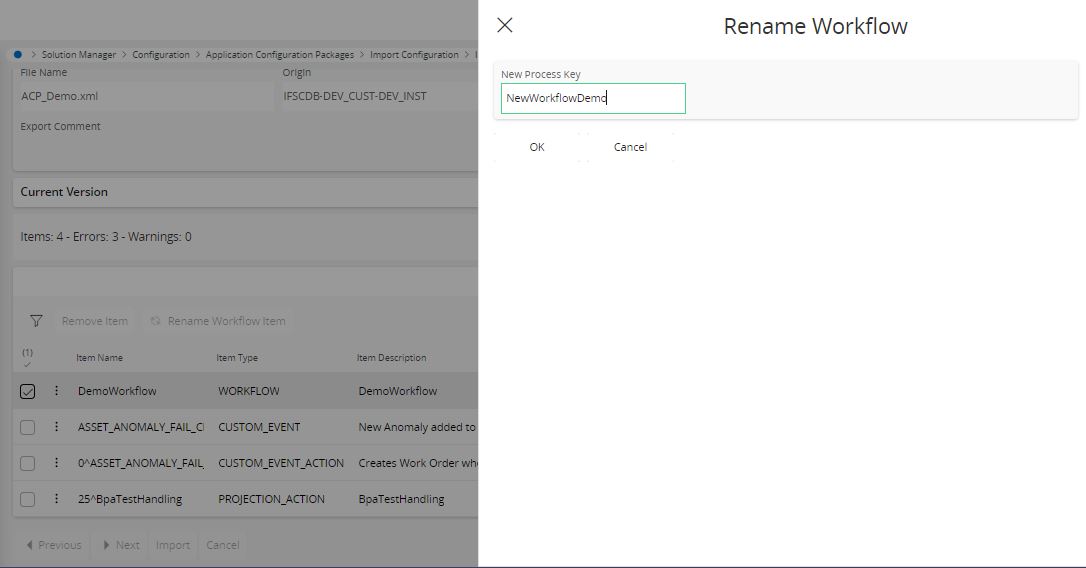 A Workflow can be imported to the target environment using IFS Cloud installer or manually. If the Workflow item status is ‘New’, a new Workflow in the target environment is created with the same process key and version as in the source environment. If the Workflow item status is ‘Modified’, a new version is created under the corresponding process key. If the Workflow is ‘Active’, it will automatically get deployed in the target environment when importing the ACP irrespective of importing manually or by IFS Cloud installer.