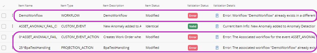In that case, importing the ACP will raise validation errors for the Workflow item and associated items as follows. All the items with validations errors will be ignored during the import.