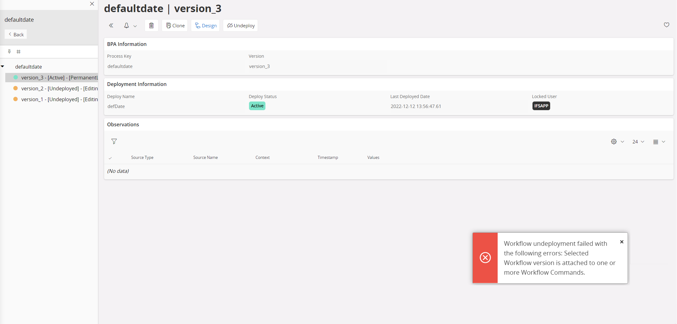 Even if a workflow is already attached to a command, you could make it incompatible for commands by activating a different version of the same workflow. Therefore, validations are in place against deployment or un-deployment operations to prevent any undesired version from getting activated. Further, it makes sure that you are not allowed to un-deploy when there is only a single deployed version preventing runtime errors.