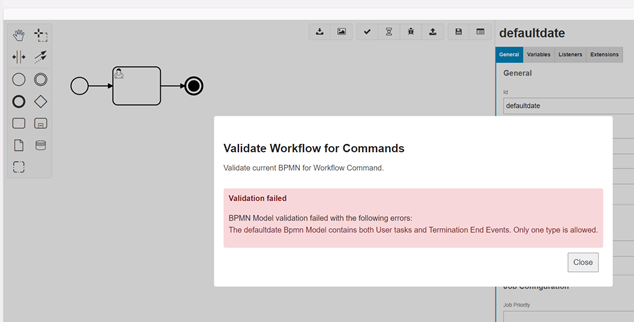 The Workflow command validation button has been introduced in the model designer as a supportive feature to the Workflow commands, serving two purposes.