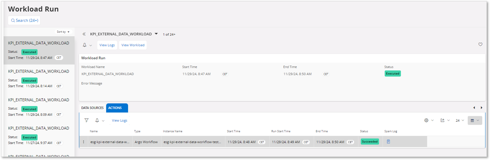 A Workload Run is created when a particular Workload Job Definition is triggered for a Run. The Workload Run page provides the overall execution status of a Workload Job Definition with detailed information on each Run. A Workload Job Definition that has only Data Sources returns the Data Source loading history and overall Workload Job Definition's status, while a system-defined Workload Job Definition returns the Data Source loading history and the status of the related Data Pipeline. This is one of the main functions of the Data Pipeline service.