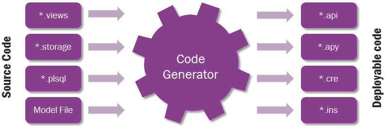 Core code is written in source code files, i.e. plsql, views and storage files. These files will also contribute with input to the generation of deployable files.