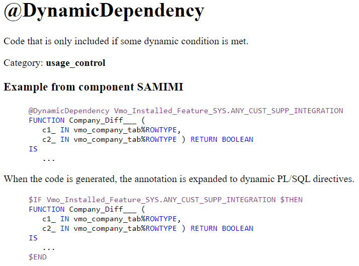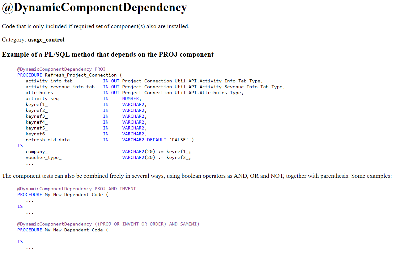 If you want an entire PL/SQL method to be excluded or included depending on another component, use the @DynamicComponentDependency annotation. It is strongly recommended to only use this annotation for implementation methods. Having it in methods published in the package specification might lead to deployment errors, and it will slow down the build time a lot. You may also use a static Boolean expression of your own to get the same result, by using the @DynamicDependency annotation.