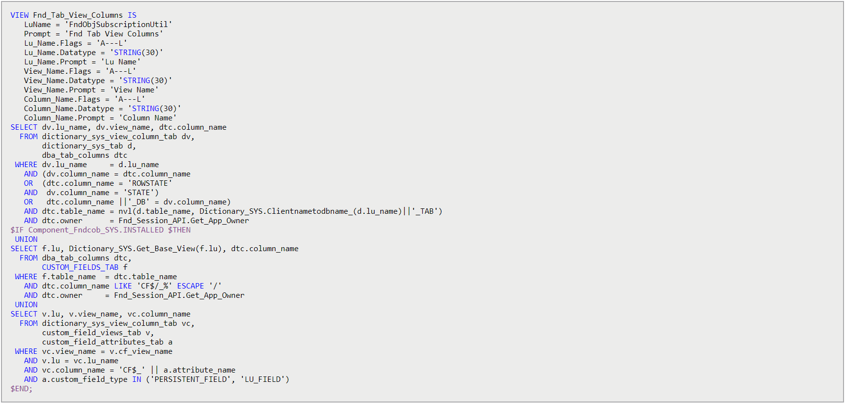 It is not possible to use Conditional Compilation when creating views in Oracle, but sometimes dynamically built views are needed while developing IFS Applications. The framework has therefore added support for having Conditional Compilation in views.