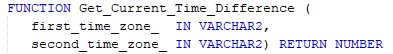 Get the time difference between two time zones, if first_timezone is a head of second Timezone the value will be a positive number, otherwise it will be a negative number. This can be directly added/subtracted from date fields to do calculations.