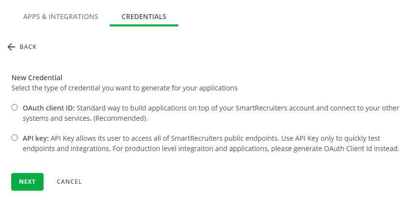 Click on the New Credential Button in the rightmost corner, and then in the next step the required authentication method can be selected to generate the credentials.