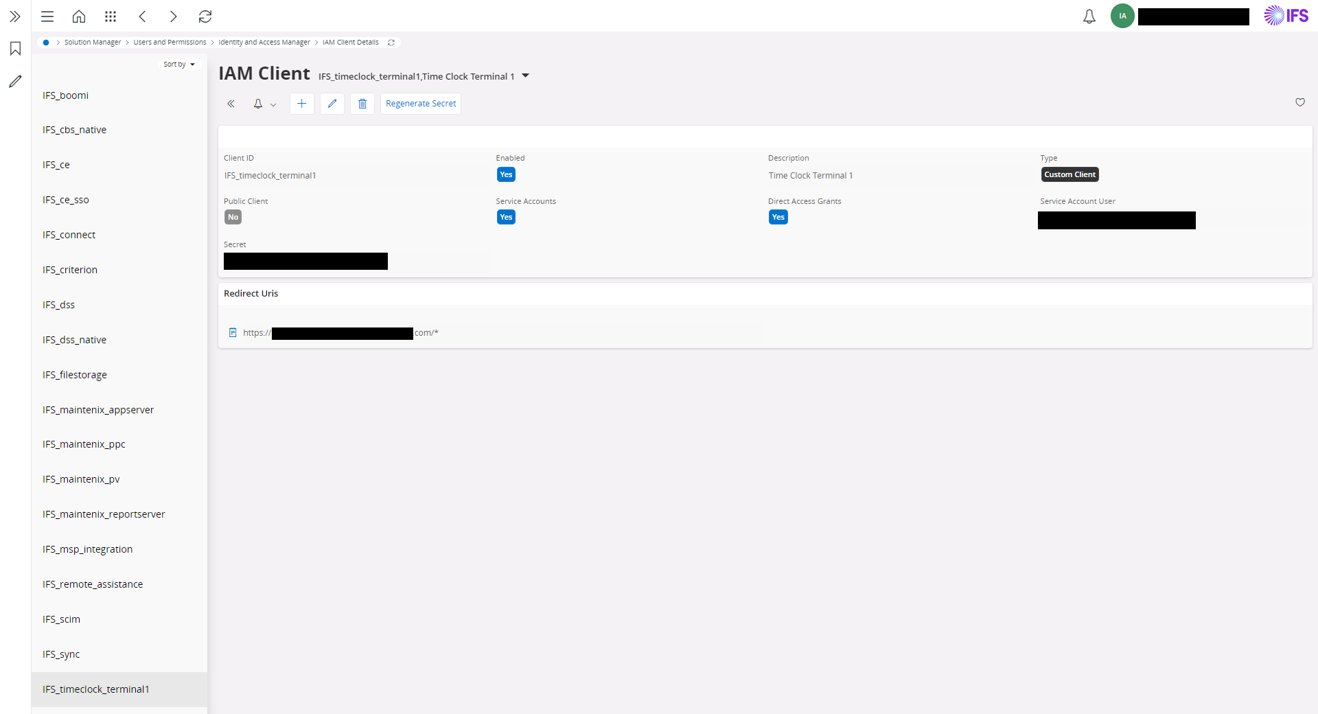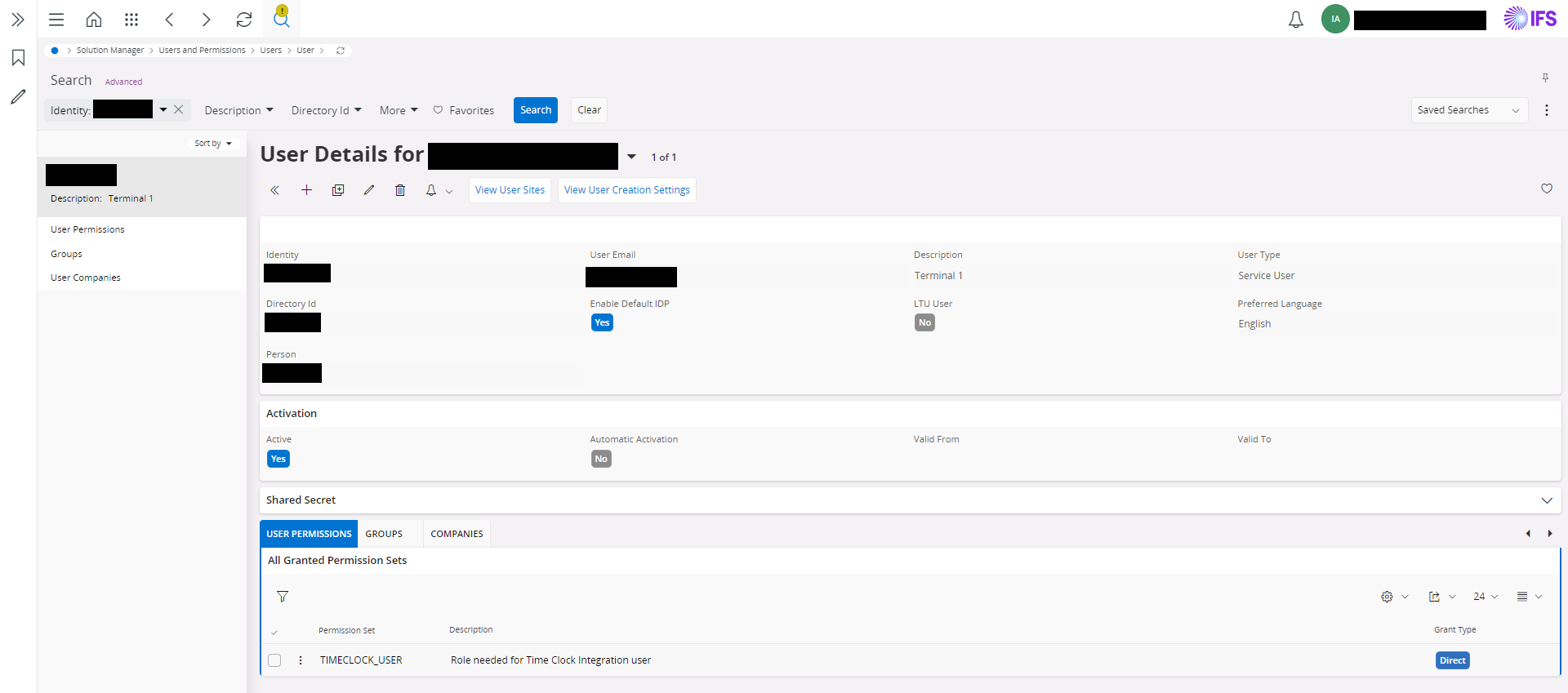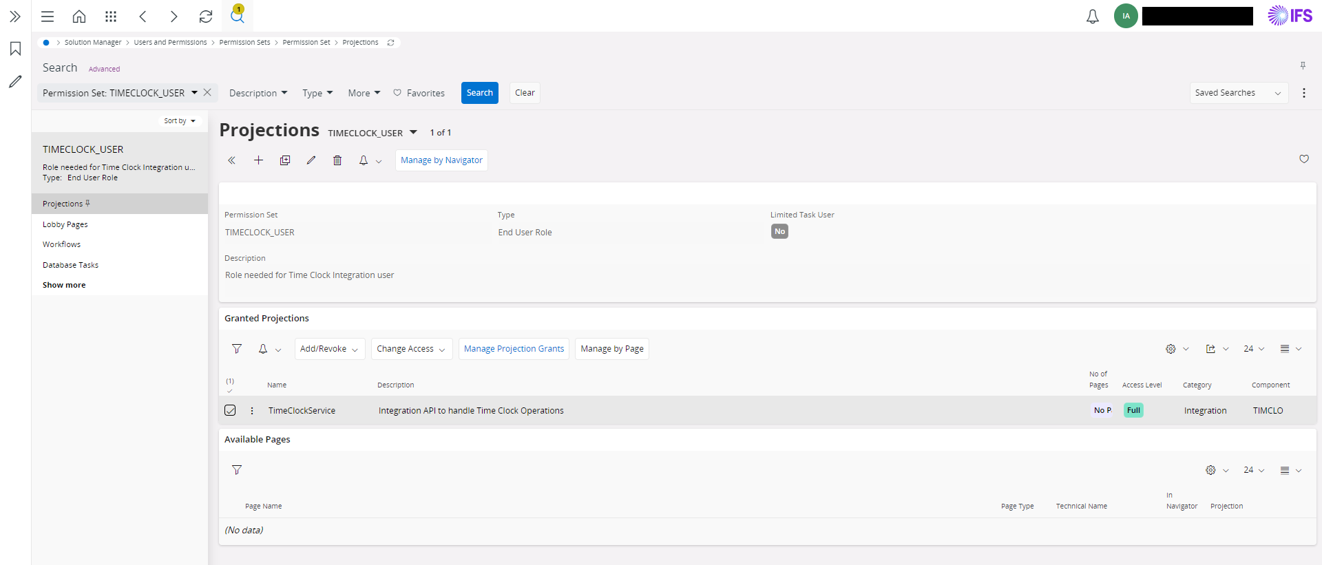 There is a predefined Permission Set for IFS Time Clock. This Permission Set should be granted to the Users created under the User Creation step.