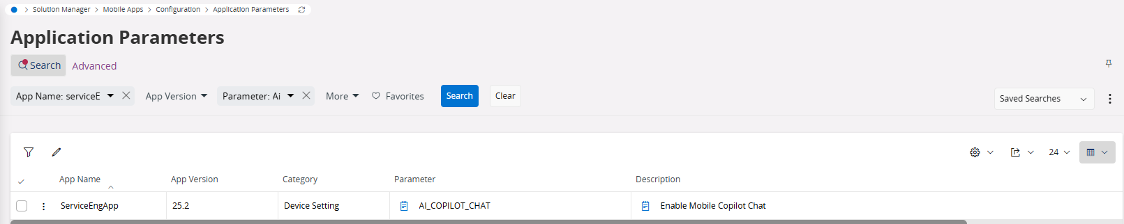 - To enable Copilot in mobile apps, set the application parameter AI_COPILOT_CHAT to ON. (The default value for this parameter is OFF)