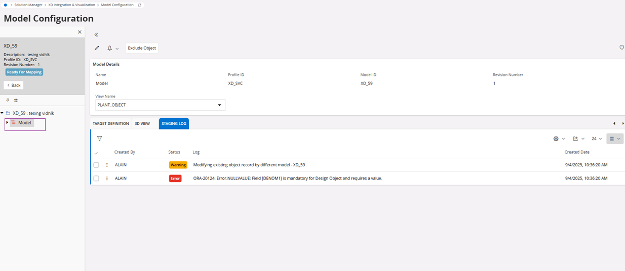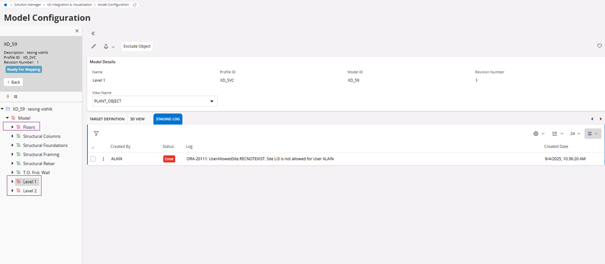 You can view the 3D View and the Staging Log related to each object by expanding the parent nodes and traversing the structure as shown below.