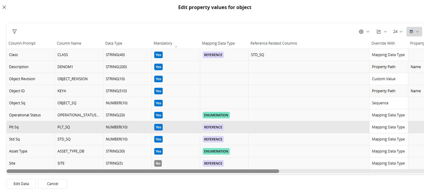 For the fields for which the value of the Mapping Data Type column is not null, the possible values are enumeration, lookup, or reference. These values can be mapped using the