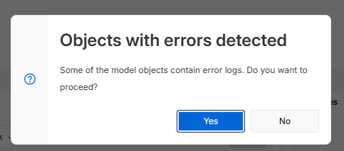 If there are warnings, errors, or both, in the staging log of a target entity, while trying to import data, the user is asked to confirm their action as shown below using two different confirmation pop-ups.