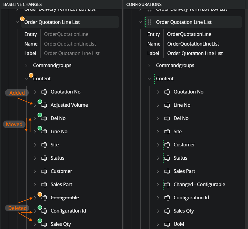 The model design storage also keeps track of the baseline in combination with the configuration. This is how our tools, e.g., Page Designer, displays the configuration changes. Even if the environment has been updated, Page Designer displays the differences between the baseline and the configured revision of the artifact.