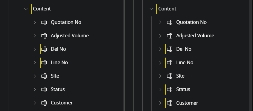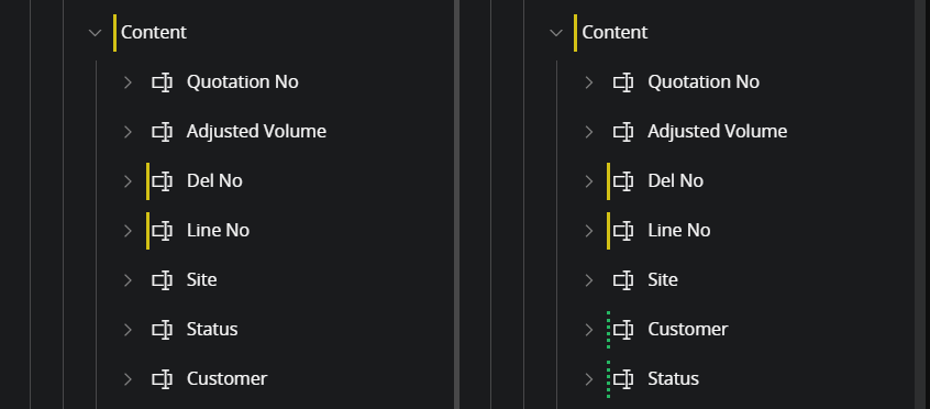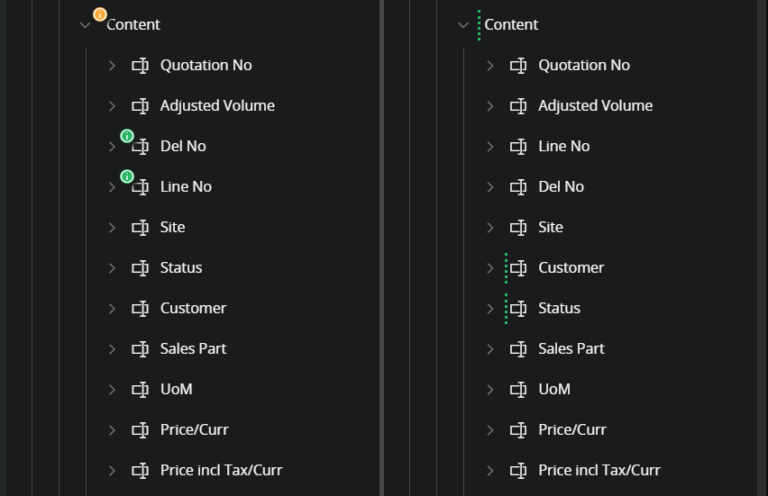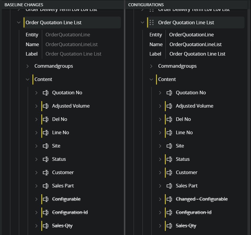 In this scenario an application upgrade contains child changes to several fields in a list. A change to a child of an item located in an array result in that the connection between the original and the configured item is lost. See detailed information in the section Join disconnected item. In practice this means that the disconnected items need to be re-connected as part of the rebase process.