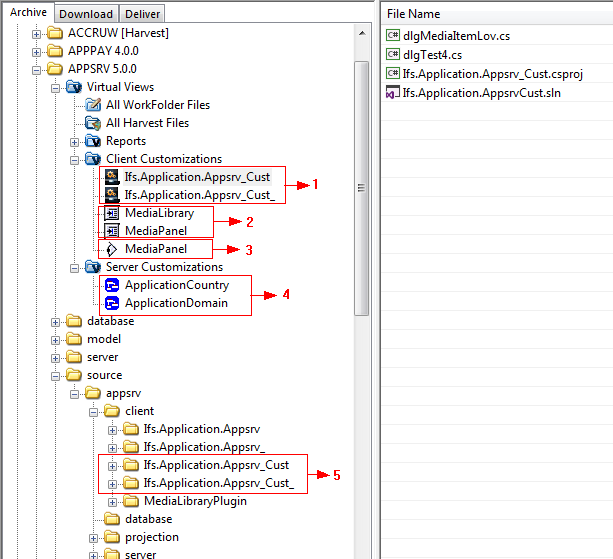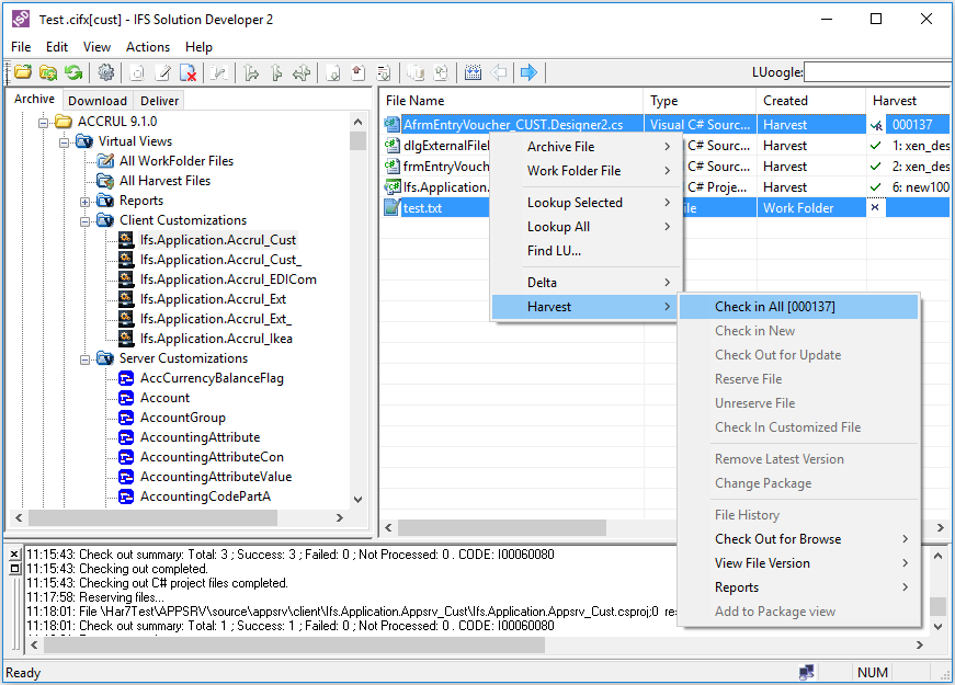 When a developer is doing a new customization or modifies an existing customization project, he or she should check in all new and existing files to harvest. Since files are in different folders, ISD 2 provides virtual views to group all related files in a flat view so that the developer can see all files in one view easily.