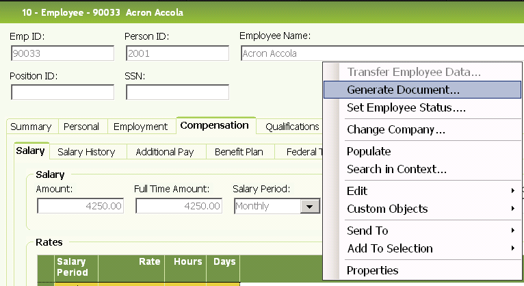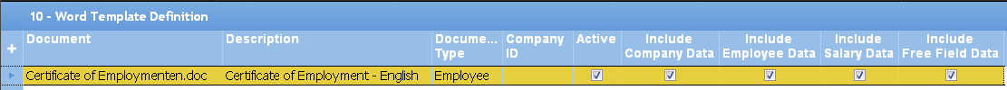 The basic data is setup in the window Word Template Definition located in the folder Human Resources / Organization Administration / Settings