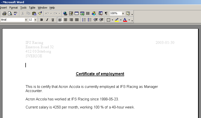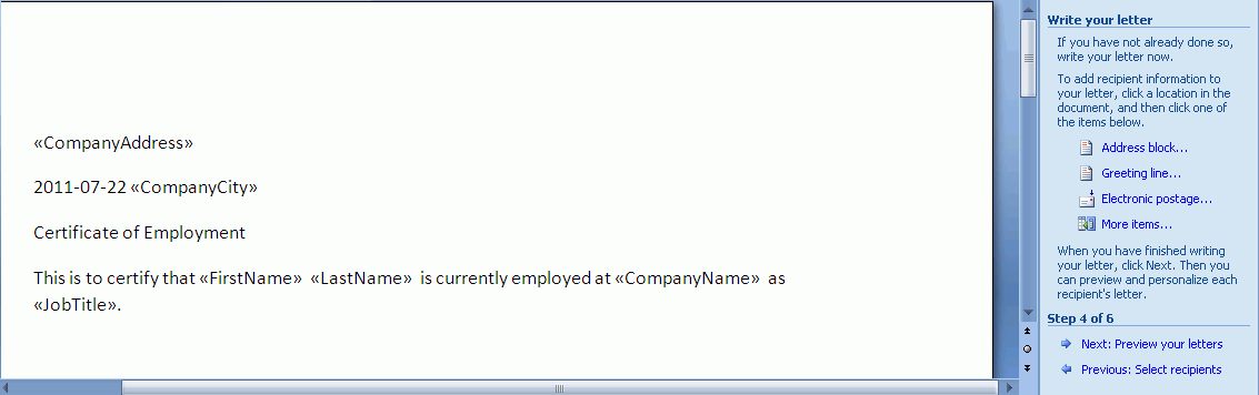 This section gives an example how information about the company and employee is merged into a mail merge document.