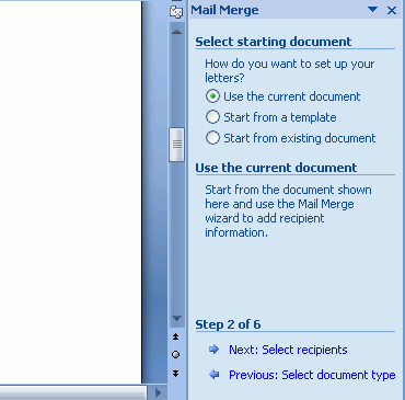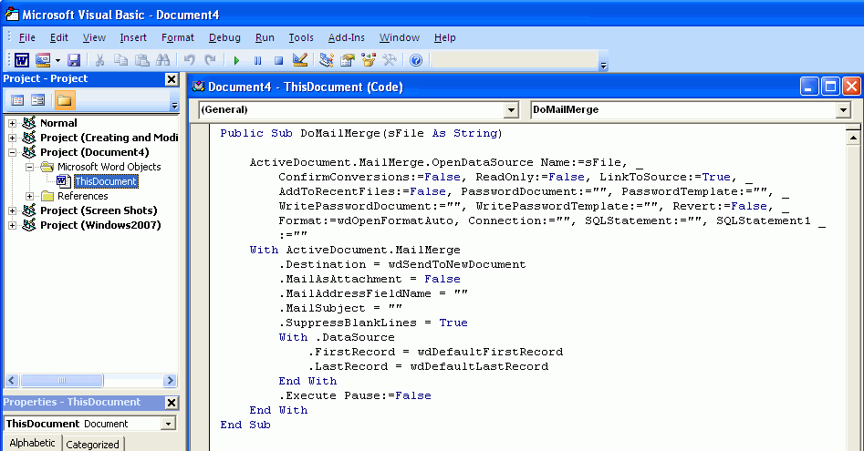 Public Sub DoMailMerge(sFile As String) ActiveDocument.MailMerge.OpenDataSource Name:=sFile, _ ConfirmConversions:=False, ReadOnly:=False, LinkToSource:=True, _ AddToRecentFiles:=False, PasswordDocument:="", PasswordTemplate:="", _ WritePasswordDocument:="", WritePasswordTemplate:="", Revert:=False, _ Format:=wdOpenFormatAuto, Connection:="", SQLStatement:="", SQLStatement1 _ :="" With ActiveDocument.MailMerge .Destination = wdSendToNewDocument .MailAsAttachment = False .MailAddressFieldName = "" .MailSubject = "" .SuppressBlankLines = True With .DataSource .FirstRecord = wdDefaultFirstRecord .LastRecord = wdDefaultLastRecord End With .Execute Pause:=False End With End Sub