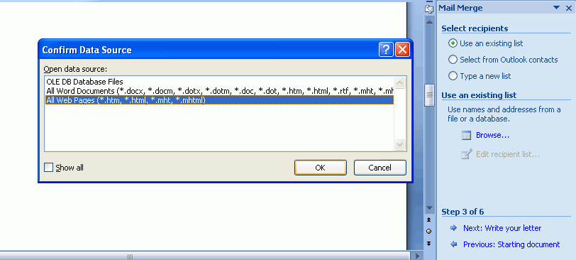 Browse to employeedata.htm and select that file, answer Yes on the next question to Edit Main Document