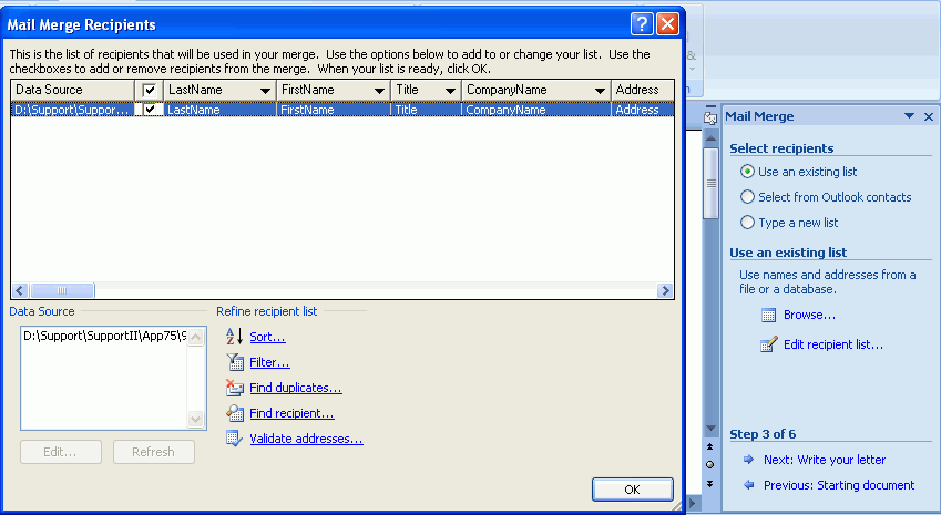 In Mail Merge Recipients check the Data Source and press OK. Then click on Next and write your Letter.
