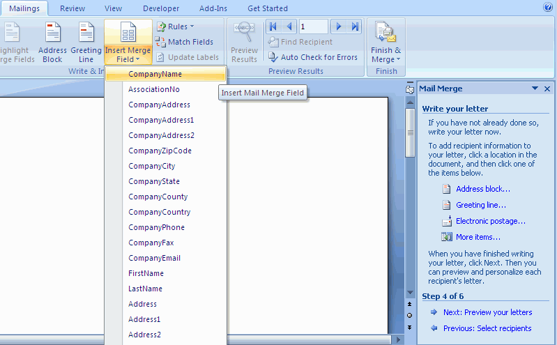 In the upper left corner of the document the alternative Insert Merge Field appears.