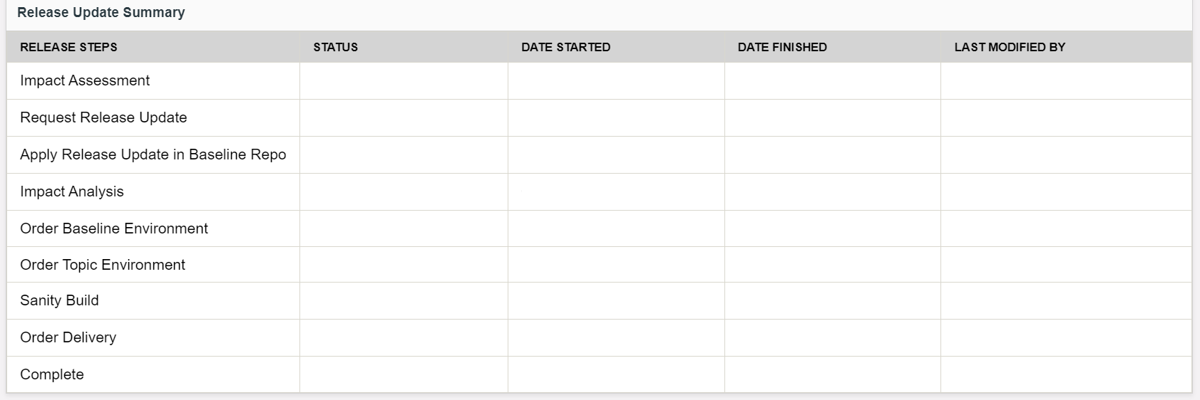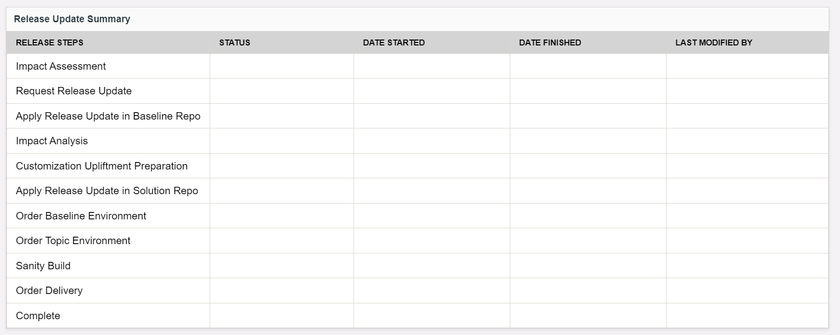 The following is the summary table for a customer who has their product in the 22R2 version or a version beyond that. These users can view Apply Release Update in Baseline Repo, Customization Upliftment Preparation, Apply Release Update in Solution Repo statuses in the summary table.
