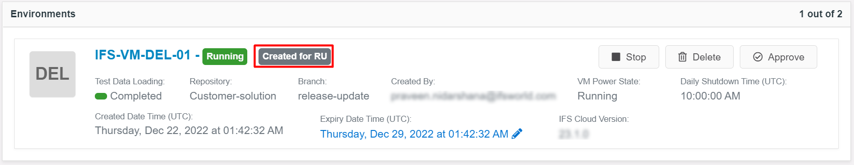 The fourth section of the screen has information on environments. The user has the option of ordering environments similar to the Build Place and the environments ordered via Release Update Studio are labeled as created for RU for easy reference.