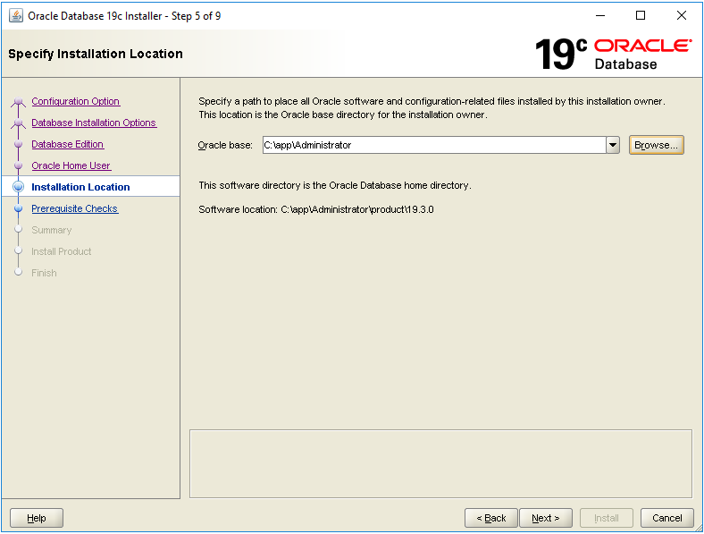 - Step 5 – Installation Location. Specify the path to $ORACLE_BASE, then press Next.