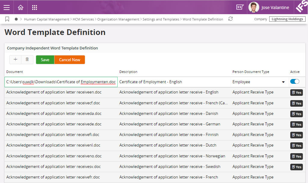 page is the place to set up word document templates for Generate Document Functionality in Employee File.