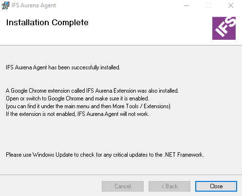 The Aurena Agent consists of two parts, an msi file that needs to be installed on the client machine and a Chrome extension that needs to be installed from Chrome Web Store.