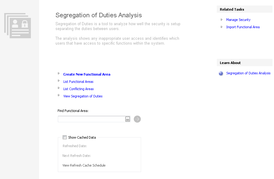 The Segregation of Duties form is the starting point when configuring the rules that are used in the Segregation of Duties Analysis. The most common tasks are available as short links on this page for example Create Functional Area and List Functional Area Conflicts.