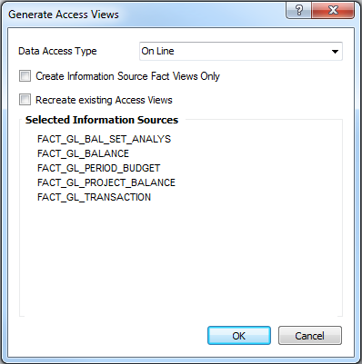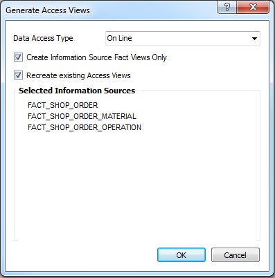 Access Views are views referencing corresponding Information Source views. The Access Views look the same independent whether they are based on On Line or Data Mart access. The views are used as the read interface in IFS Applications when extracting data to the SQL Server database.
