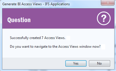 Click OK to start creating the Access Views. When the views have been created a dialog will pop up displaying number of created views and the user is asked if it is required to navigate to the Access View window. Select Yes to see more details about created Access Views.