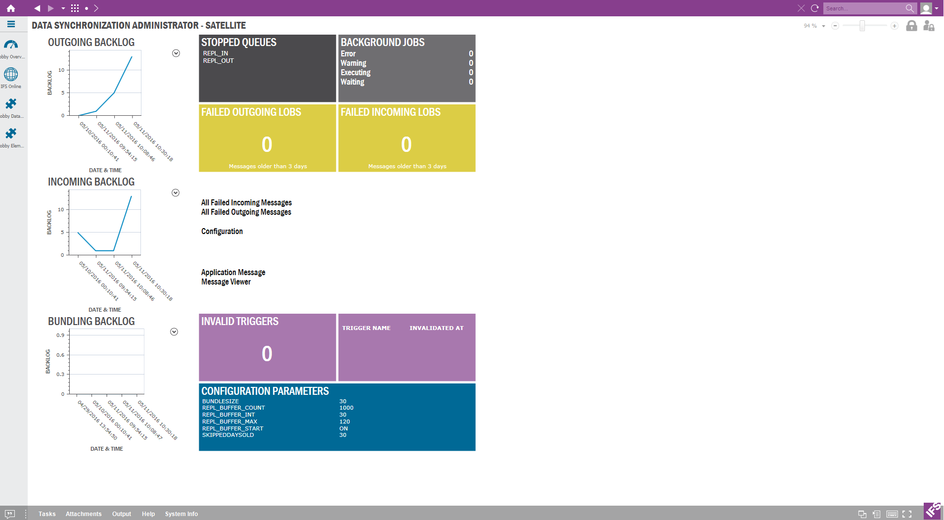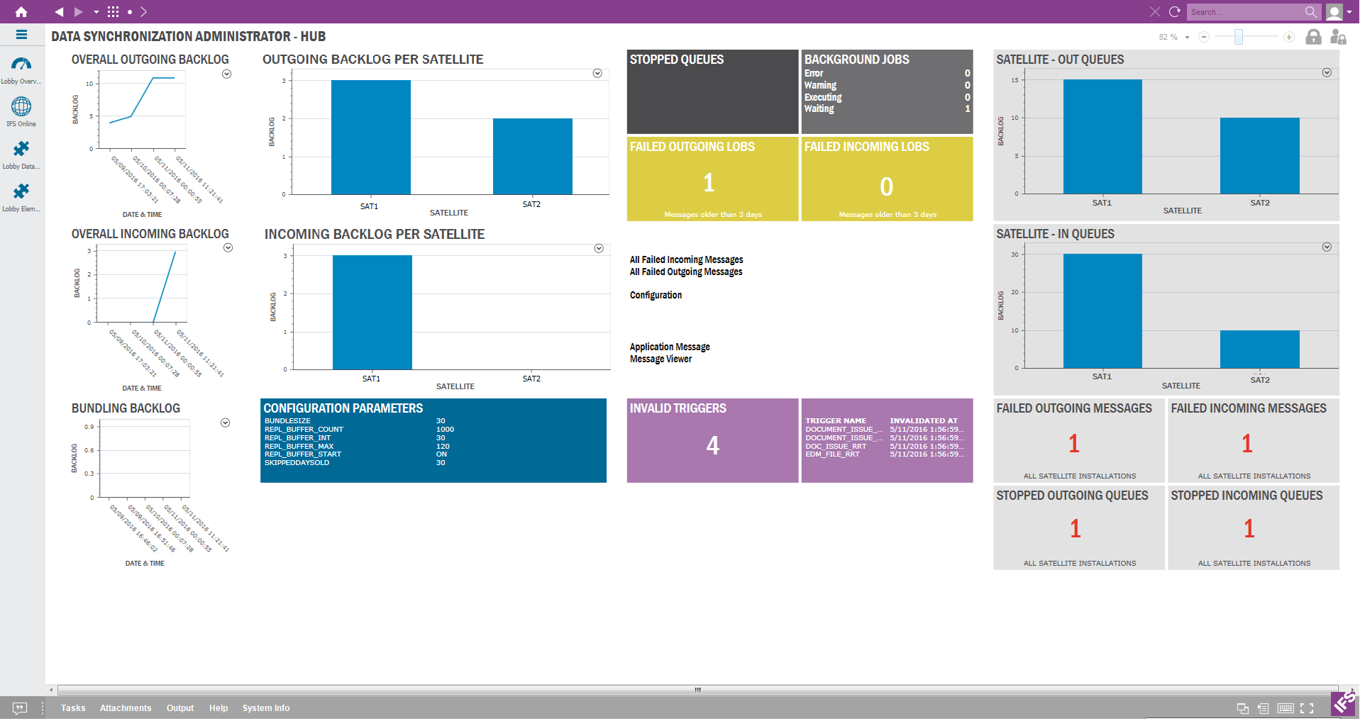 The Data Synchronization Administrator Lobby pages highlight and visualize important information for Data Synchronization Administrator. There are two lobby pages related to Data Synchronization. One is for the Data Synchronization Administrator at the HUB. and the other is for Data Synchronization Administrator at the Satellite .