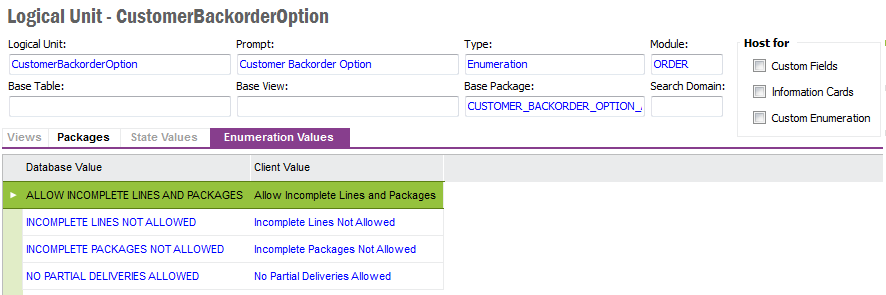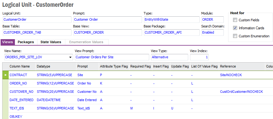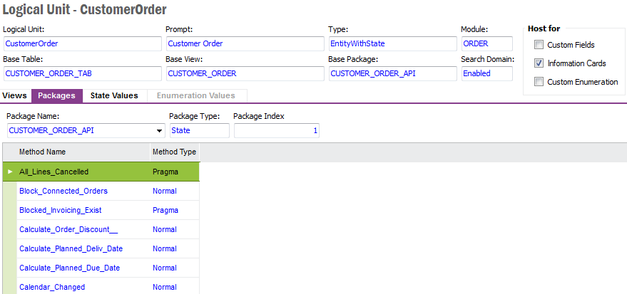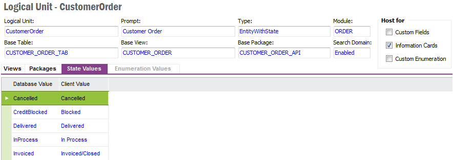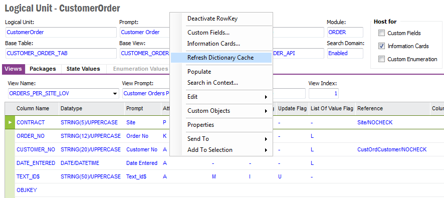 From the detail form of a Logical Unit it is possible to navigate to Custom Fields, Information Cards or Custom Enumeration. It is also possible to Activate or Deactivate RowKey and Refreshing the Dictionary Cache.