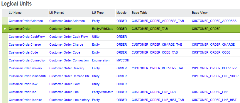 A Logical Unit is a business object such as a "Customer" or "Sales Part" object that defines the attributes, methods and relationships to other logical units. A typical Logical Unit consists of an Oracle table in the Data Storage Layer, PL/SQL Procedures and Functions and an Oracle View in the Business Logic Layer, and one or more Application Forms in the Presentation Layer.