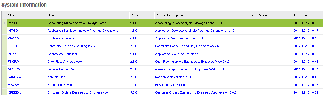 This form shows all components and some basic information about these. All installed components have a version. Components which are not installed do not display a version number.