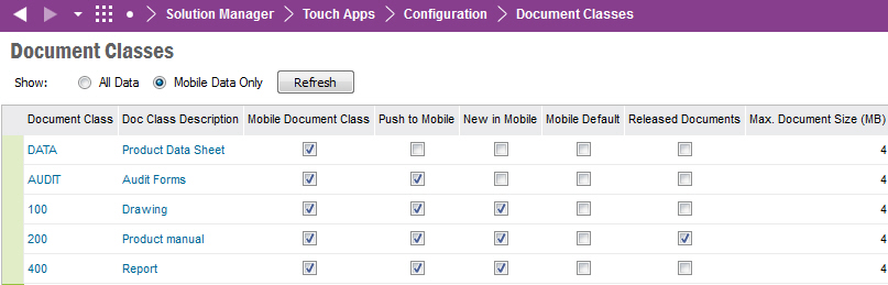 Use this screen to indicate which document classes are to be used in mobile applications. It is possible to switch views between looking at all document classes registered in the system or just showing the document classes set as mobile document classes.
