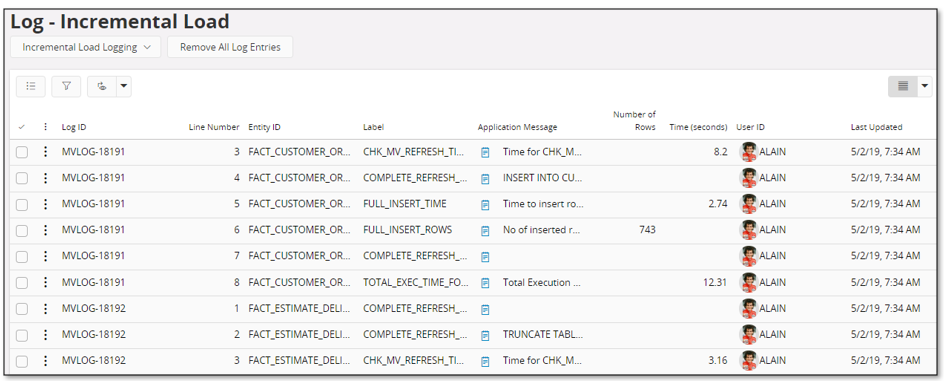 The page Log - Incremental Load logs all steps performed during incremental load.