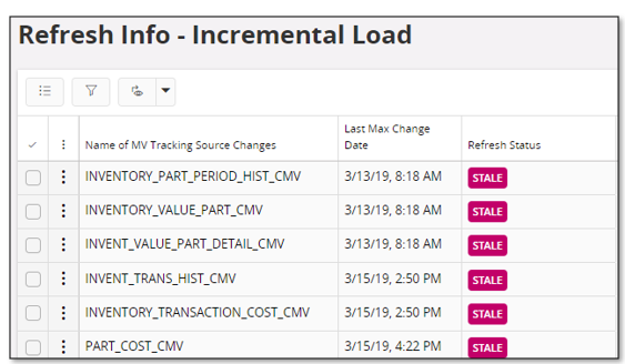 Opens the Refresh Info - Incremental Load page that lists all special tracking Materialized Views (MVs) used to track changes in referenced source tables.