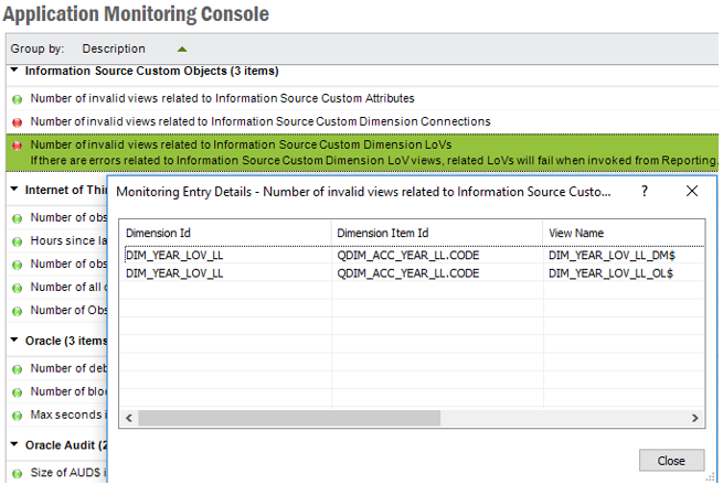 The Custom Dimension LoV definitions lead to that existing Dimension/Fact source views are referenced. If something happens to the tables referenced by the source views, the source views might get invalidated, which will affect LoV related views that are indirectly referencing the source tables.
