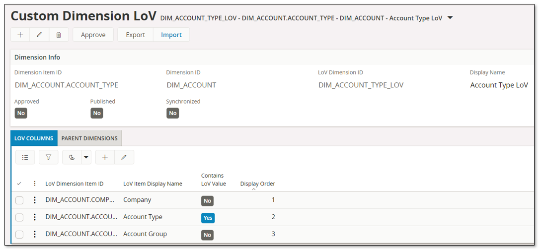 | Approved | Defines whether the Custom Dimension LoV definition is approved for publishing |